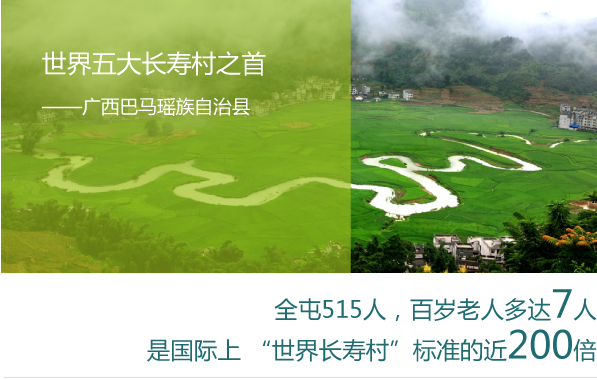 廣西巴馬瑤族自治縣位于廣西盆地和云貴高原的斜坡地帶,總?cè)丝?3萬人。據(jù)廣西巴馬縣民政局消息,截止到2010年6月8日,廣西巴馬瑤族自治縣100歲及以上的長壽老人達(dá)87人,每10萬人里有37.826個(gè),是國際長壽村標(biāo)準(zhǔn)的5.043倍。比2000年第五次全國人口普查時(shí)74人多13人。是世界五大村中惟一長壽老人不斷增多的地方。被譽(yù)為世界五大長壽村之首。其中,一個(gè)叫甲篆鄉(xiāng)平安村巴盤屯的地方,全屯515人,百歲老人多達(dá)7人,是國際上 “世界長壽村”標(biāo)準(zhǔn)的近200倍。