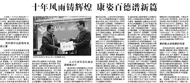 報道從公司的科研成果、改革創(chuàng)新精神、人才引進(jìn)和團(tuán)隊建設(shè)、主題活動、未來憧憬等方面,反映了公司成立10年來所取得的一系列驕人業(yè)績和公司發(fā)展過程中形成并堅持的品質(zhì)精神、價值理念、管理運營模式。這是該報為公司10周年華誕送上的一份大禮,必將激勵全體康姿百德人在新的起點上振奮精神、開拓進(jìn)取,取得新的更大的業(yè)績。