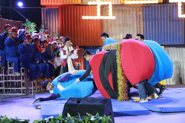 本次《五一七天樂》節(jié)目的主題是“五一七天樂,勞動(dòng)更快樂”。節(jié)目在獨(dú)具勞動(dòng)特色的開場舞《最炫民族風(fēng)》中拉開演出序幕,于文華、管彤推著小推車出場,車上的大箱子引起了觀眾們的好奇。正當(dāng)觀眾遺憾和猜測禮物是什么的時(shí)候,老畢出奇意外地從箱子里出來,這份始料未及的“大禮”頓時(shí)引起了現(xiàn)場觀眾一陣歡呼。隨后其他嘉賓分別騎玩具小車登臺(tái),《五一七天樂》節(jié)目開始。節(jié)目以比賽的形式進(jìn)行,眾位嘉賓分成“紅薯”和“拔絲”倆隊(duì),現(xiàn)場比拼才藝。