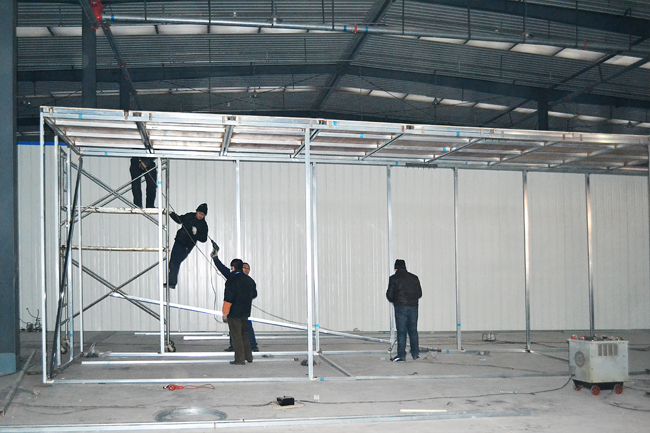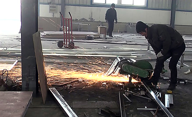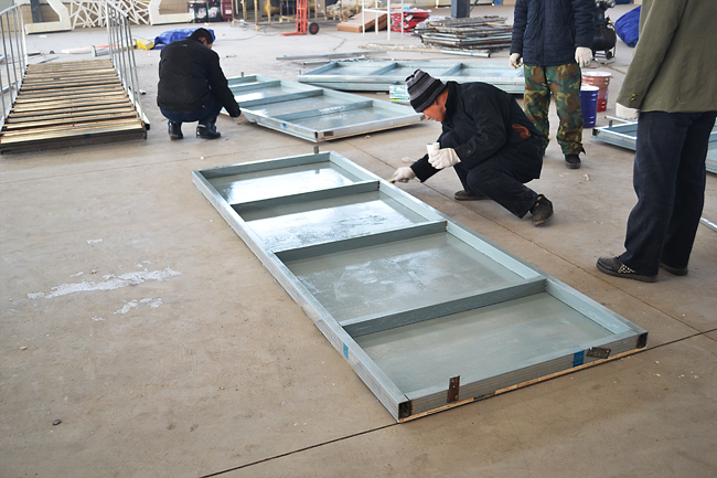 1500平方米的制造車間內(nèi),機(jī)器轟鳴、電焊火花四濺,一派繁忙景象。工人們手持電焊機(jī)、切割機(jī)、雕刻機(jī)、角磨機(jī)、電鉆、手提鋸、曲線鋸、自制刀剪等十八般武器,各顯神通。從28日晚上8點(diǎn)接到任務(wù)到31日晚8點(diǎn),制造中心的50多名工人每天都要忙碌到凌晨3點(diǎn)。