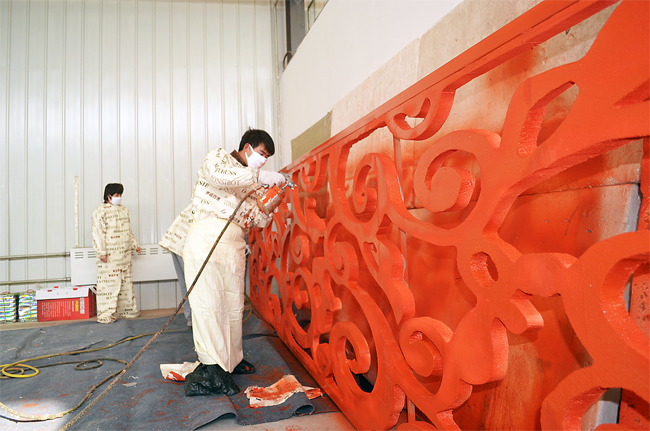 制造中心現(xiàn)場(chǎng)總指揮張振忠經(jīng)理介紹:“舞臺(tái)背景氣勢(shì)宏偉,運(yùn)用了燈籠、瓷器、木雕、中國(guó)結(jié)、山水畫、鏤空屏風(fēng)、青磚墻等豐富的中國(guó)文化元素進(jìn)行布局裝飾,工程量和工藝難度非產(chǎn)大。時(shí)間緊、任務(wù)重,要不打折扣的實(shí)現(xiàn)圖紙的設(shè)計(jì)風(fēng)格,我們的壓力山大啊”。