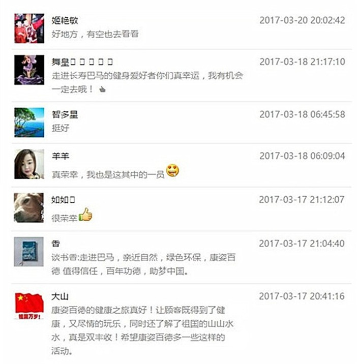 此次“走進長壽巴馬 共譜健康人生”健康之旅活動反響熱烈,得到了健身愛好者的廣泛好評。自前幾篇報道巴馬健康之旅的文章發(fā)出后,許多健身愛好者都通過在微信公眾平臺文章下方留言評論的方式表達了自己的體會和感受。