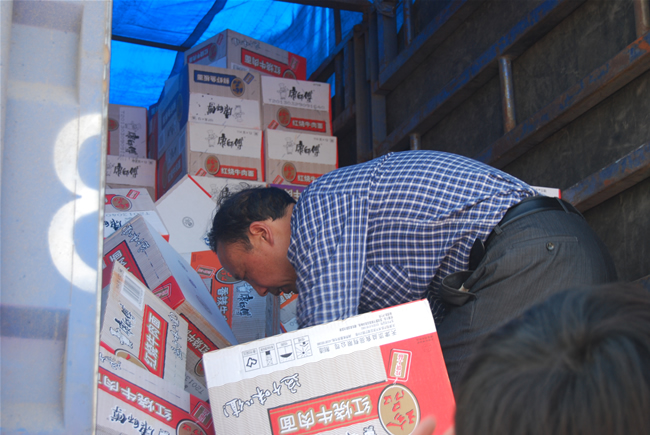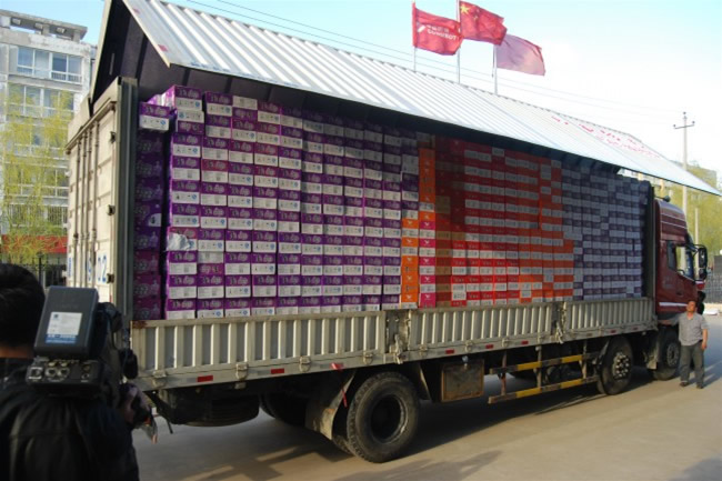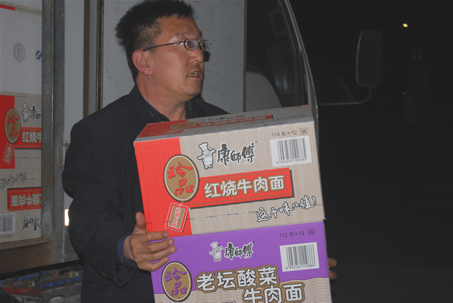 25日凌晨三點,康姿百德救災(zāi)物資車隊到達北京。房山康姿百德總代理李三喜,代表延慶、通州、門頭溝、密云、昌平、景山、唐山、延吉、廊坊以及華夏經(jīng)典等地的代理商將愛心物資裝上貨車