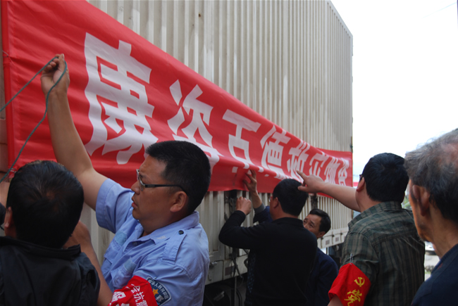 滿救災(zāi)物資的貨車離開康姿百德公司,駛向災(zāi)區(qū)