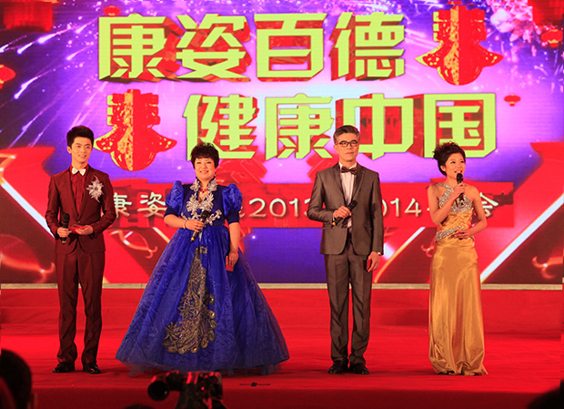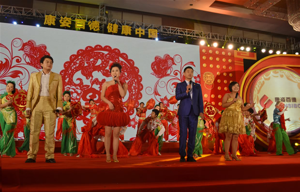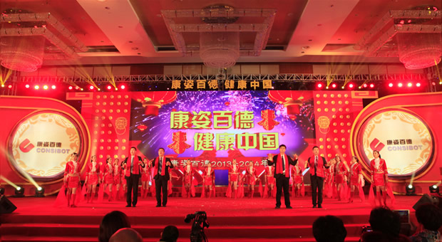 中午1時許,從全國各地趕來參加年會的經(jīng)銷商蜂擁而至。會場門前,由公司督導師組成的禮儀隊,身著禮服,面帶微笑,列隊歡迎大家的到來,一句句“過年好”、“歡迎您回家”、“您辛苦了”的問候聲不絕于耳。會場內,由公司員工自己搭建的舞臺燈光閃爍,絢麗多彩,懸掛于舞臺兩側的大紅燈籠顯得格外耀眼;舞臺背景的LED屏幕上,“康姿百德、健康中國”、“康姿百德2013-2014年會”等字幕交替顯示;偌大的大廳內,40張餐桌上擺滿了水果、瓜子、花生、飲料……。大家邊吃邊聊,噓寒問暖,徜徉在幸福和愉悅之中,盡情享受著家一般的親切和溫暖。