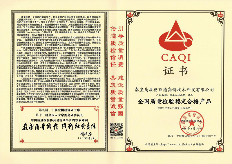 此外,康姿百德還分別榮獲3.15主題活動(dòng)中“全國(guó)產(chǎn)品和服務(wù)質(zhì)量誠(chéng)信示范企業(yè)”、“全國(guó)質(zhì)量檢驗(yàn)穩(wěn)定合格產(chǎn)品”兩項(xiàng)榮譽(yù)。