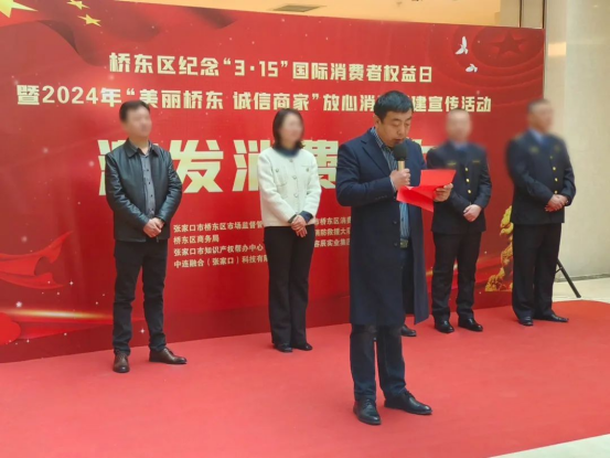3月15日上午,張家口橋東區(qū)市場(chǎng)監(jiān)督管理局、張家口橋東區(qū)消費(fèi)者權(quán)益保護(hù)委員會(huì)聯(lián)合舉辦了“315國際消費(fèi)者權(quán)益日”的主題活動(dòng)??底税俚聫埣铱诘貐^(qū)總經(jīng)理安峰逸作為優(yōu)秀企業(yè)代表,受邀出席本次活動(dòng)并講話。