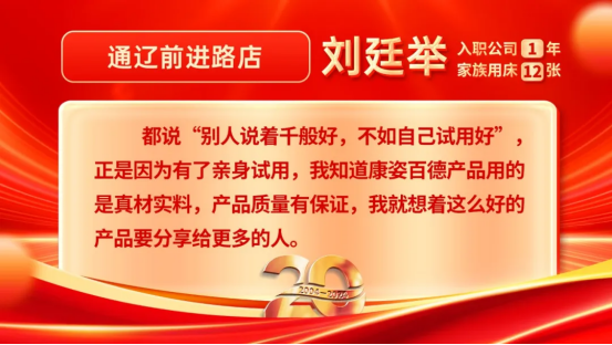 劉廷舉還說:“感謝康姿百德,讓我在這里收獲了很多親人,讓我們感受到了很多溫暖,這也讓我干著很有底氣。尤其是將這么好的產(chǎn)品介紹給親朋好友使用后,也讓我們的親情和友情更加濃厚了?,F(xiàn)在,我的家人都很支持我的工作。家人們不光認(rèn)可公司,還認(rèn)可康姿百德的產(chǎn)品,目前我的家族已經(jīng)使用12張康姿百德床墊了。家人的支持和鼓勵(lì),是我最堅(jiān)實(shí)的后盾,我也有信心,在康姿百德創(chuàng)造更大的價(jià)值。”