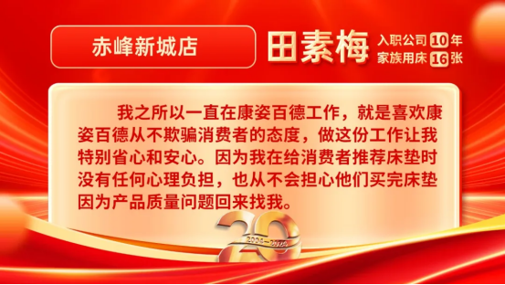 田素梅還說道:“我之所以一直在康姿百德工作,就是喜歡康姿百德從不欺騙消費(fèi)者的態(tài)度,做這份工作讓我特別省心和安心。因?yàn)槲以诮o消費(fèi)者推薦床墊時(shí)沒有任何心理負(fù)擔(dān),也從不會擔(dān)心他們買完床墊因?yàn)楫a(chǎn)品質(zhì)量問題回來找我。今年是康姿百德成立20周年,我覺得公司能夠發(fā)展的越來越好、越來越壯大,離不開認(rèn)真做產(chǎn)品,真誠對待消費(fèi)者。希望我能在這么好的公司一直干到退休?!?/span>