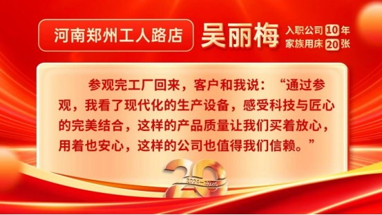 今年是康姿百德集團成立20周年。在20年的發(fā)展歷程中,有這樣一群人,他們在市場經(jīng)營管理過程中,深刻貫徹以客戶為中心的理念,始終把優(yōu)質(zhì)的服務融于門店經(jīng)營的每個環(huán)節(jié),也因此得到了客戶的贊賞和認可。他們就是康姿百德專賣店的員工。本期和您分享的是康姿百德河南地區(qū)和福建地區(qū)專賣店員工代表的故事。