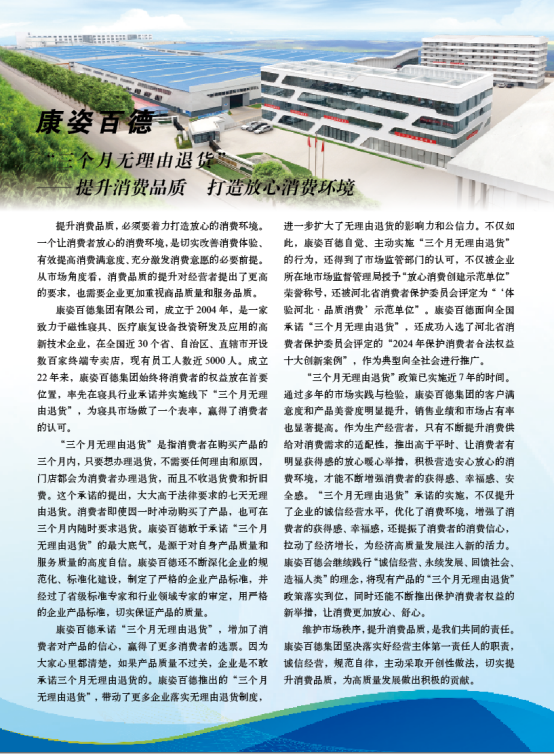 《中國(guó)消費(fèi)者報(bào)》是國(guó)家市場(chǎng)監(jiān)督管理總局主管、中國(guó)消費(fèi)者協(xié)會(huì)主辦的全國(guó)性報(bào)紙,在消費(fèi)維權(quán)輿論監(jiān)督領(lǐng)域具有高度權(quán)威性、公信力和影響力。康姿百德以誠(chéng)信經(jīng)營(yíng)、積極維護(hù)消費(fèi)者合法權(quán)益的良好社會(huì)形象,連續(xù)10年被《中國(guó)消費(fèi)者報(bào)》專題報(bào)道。